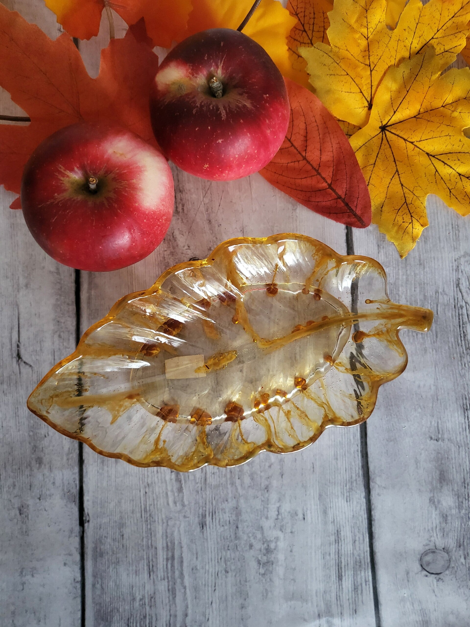 Découvrez ce vide-poche unique en forme de feuille transparente, avec des marbrures de jaune foncé qui ajoutent une touche de chaleur et de sophistication, parfait surtout pour l'automne.
