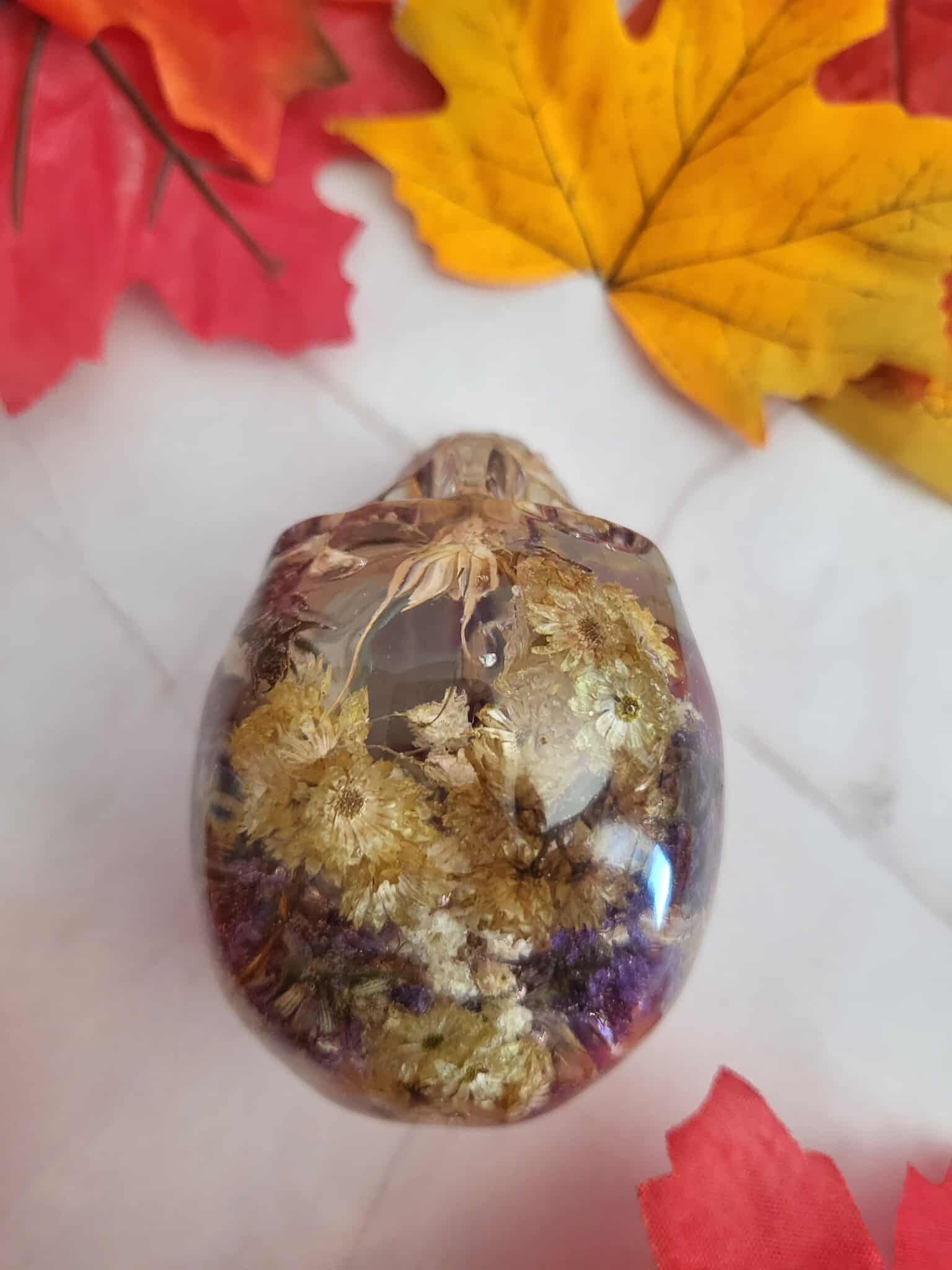 Découvrez ce crâne unique en résine époxy orné de fleurs divers incrustée. Cette pièce artistique combine la beauté de la nature avec l'élégance de la résine époxy.