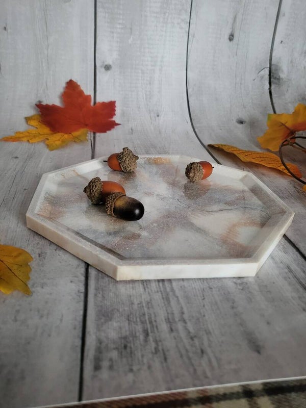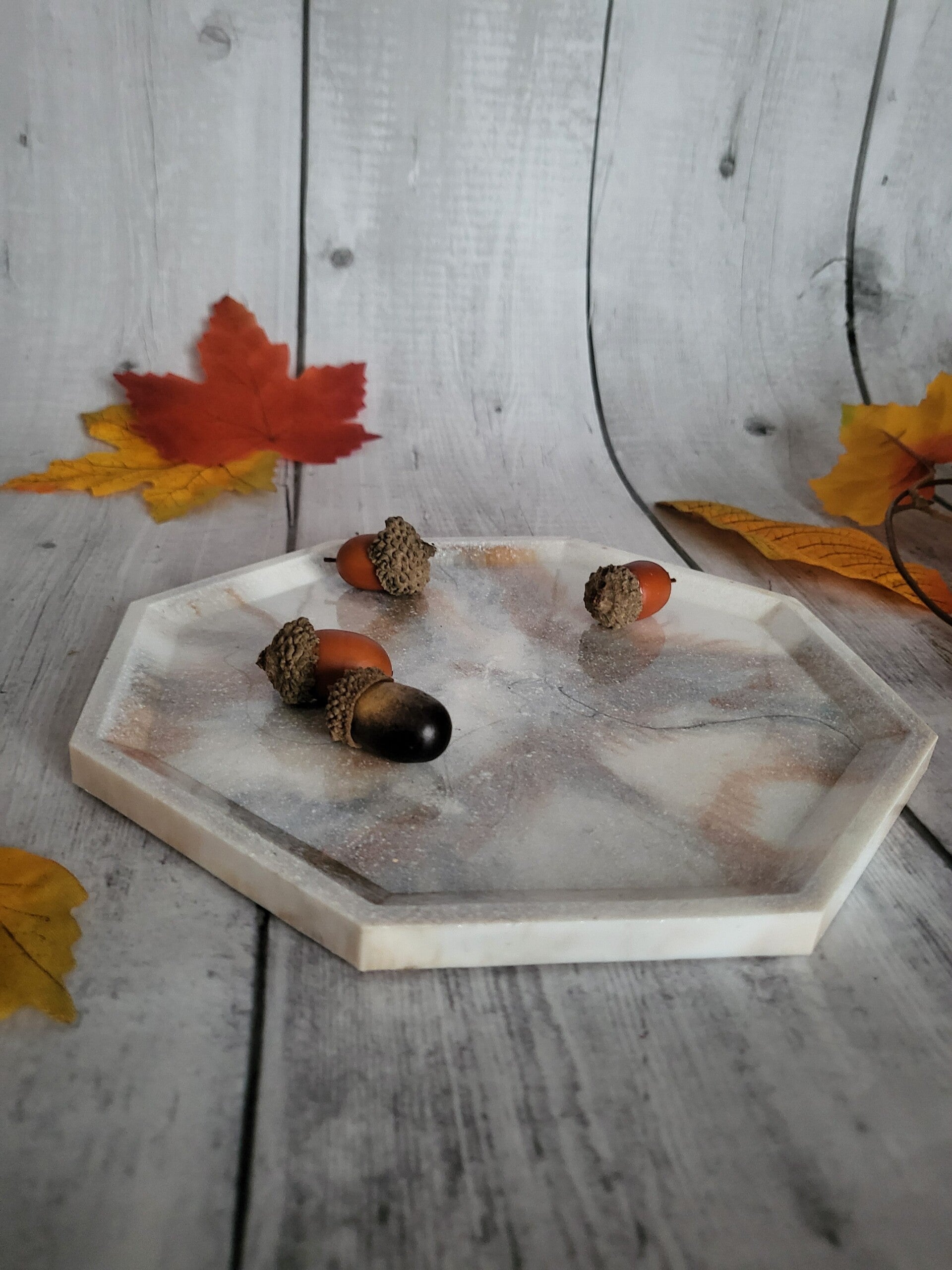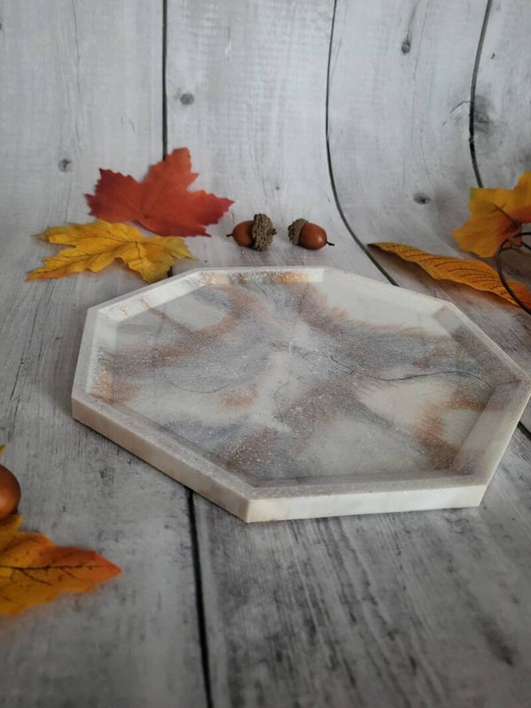 Plateau Hexagonal Blanc Pailleté et Marbré Orange et Doré