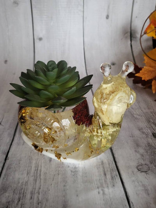 Cet escargot en résine époxy peut être utilisé comme objet de décoration pour votre maison ou votre jardin. La carapace creuse permet d'accueillir une plante grasse, ajoutant une touche de verdure à votre espace.