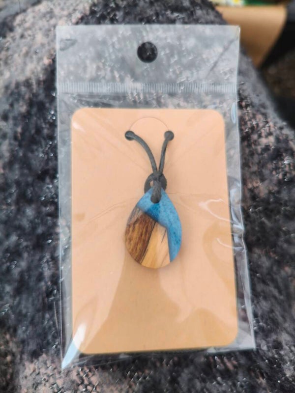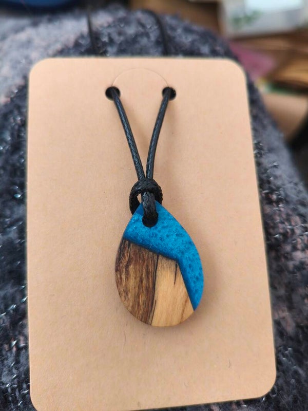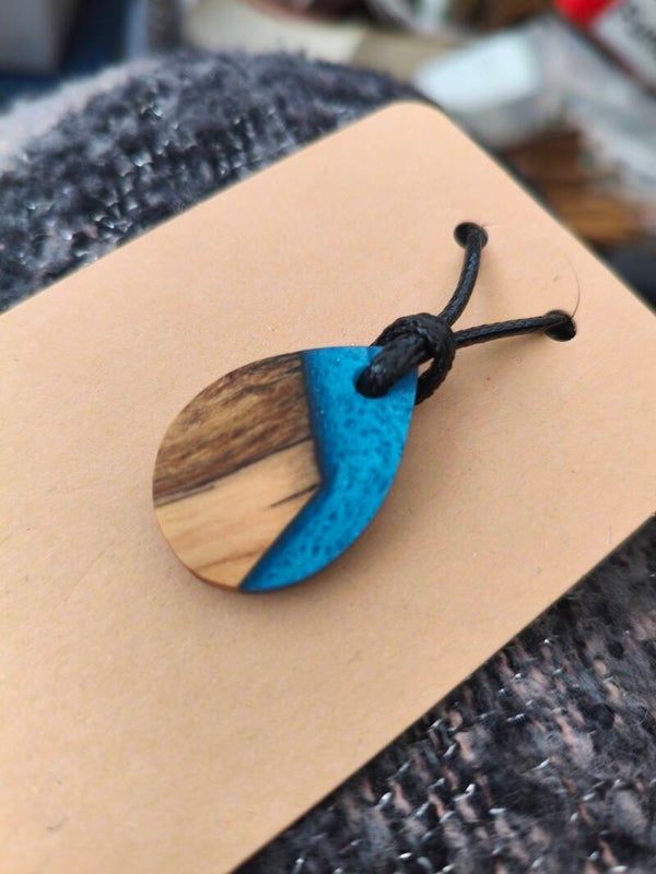 Découvrez ce collier unique en bois de noyer et résine époxy bleue, un mélange parfait de naturel et de modernité.